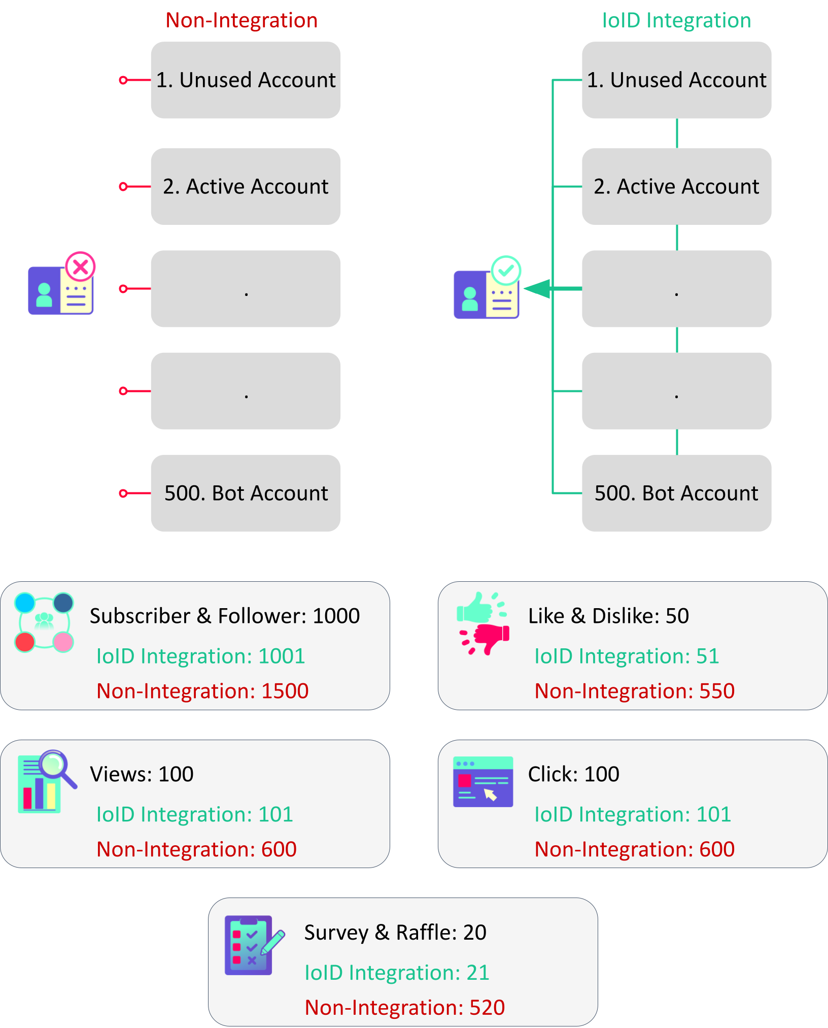 With the IoID integrations, the platform owners will know how many accounts the internet identity wants to open a new membership has on the platform. As a result, it will prevent the person from making bots with hundreds of accounts and manipulating the data. If a user opens a second account, if they follow the people they follow in the first account again in the second account, this number will be counted as one and unconscious data manipulations will be prevented.